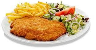 wordt geserveerd met kipschnitzel champignonroomsaus salade fiet/aardappelschijfjes of rijst met saus naar keuzeIncl. € 0,15 Wettelijke Milieu Toeslag