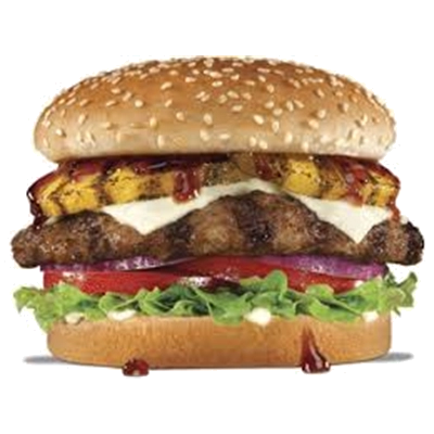 wordt geserveerd met een broodje ambachtelijke runderhamburger sla tomaat augurk ananas gesmolten kaas met BBQ SausIncl. € 0,15 Wettelijke Milieu Toeslag